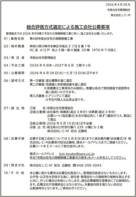 寺尾台住宅管理組合は、大規模修繕工事の施工者を募集する。=左欄に公告