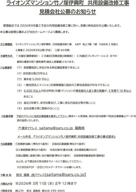 • 発注公告・ライオンズマンション竹ノ塚伊興町管理組合