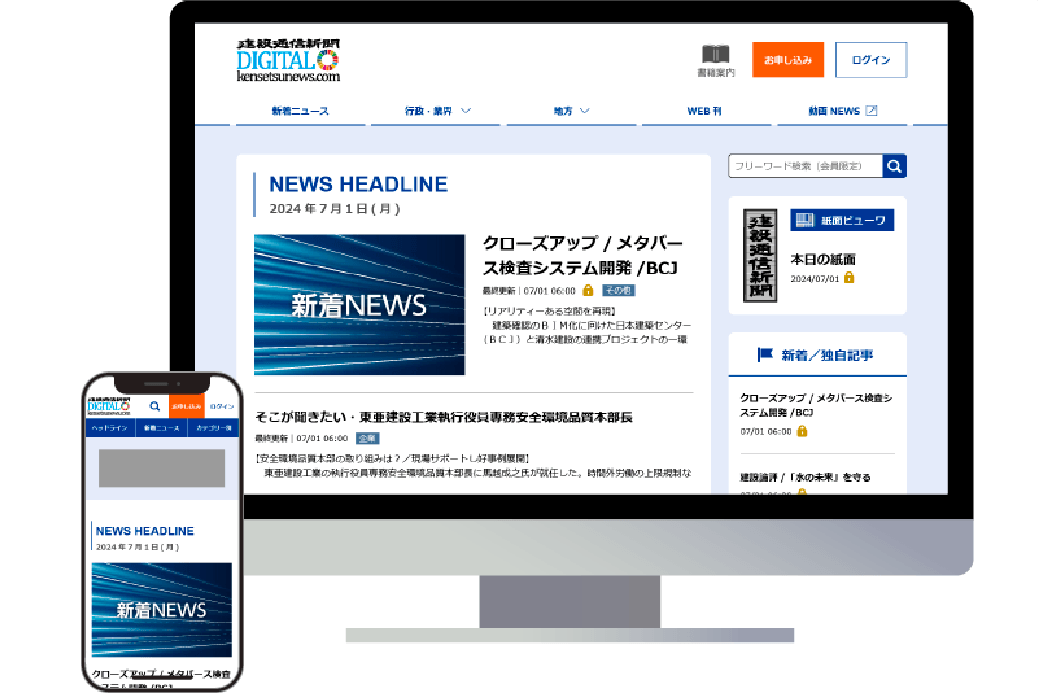 「ニュースサイト」を前面に、「建設通信新聞 Digital」「(月刊)建設工事の動き」などのコンテンツとクロスリンクするデザインです。
