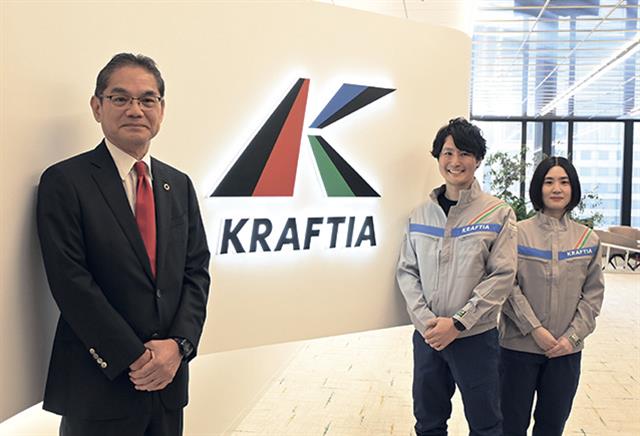 九電工(現クラフティア)は9月30日、福岡市中央区の本社で10月1日からの新社名である「クラフティア(KRAFTIA)」の新ロゴマーク除幕式を開いた=写真。