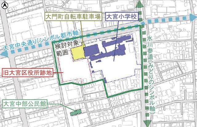 対象地は、大宮駅から東西に延びる大宮中央通りと、氷川神社とさいたま新都心を結ぶ氷川参道の結節点に位置している。拠点都市として機能強化するため、公共用地だけでなく、隣接する民有地双方の土地活用を目指す。