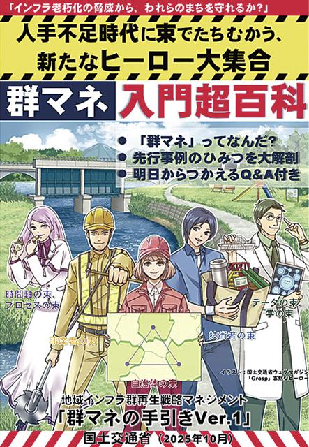 国土交通省は14日、地域インフラ群再生戦略マネジメント(群マネ)の導入を促す地方自治体向けの手引きを公表した。群マネ導入の標準的な手順や検討すべき項目を解説。自治体間の協定書や発注図書のサンプルなど実装を後押しする支援ツールも収録した。群マネの全国展開に向けて、今後地方自治体に手引きの内容を説明していく。 「群マネの手引きVer・1(群マネ入門超百科)」と銘打ち公表した。群マネの「計画策定手法検討会」「実施手法検討会」での議論を反映した。
