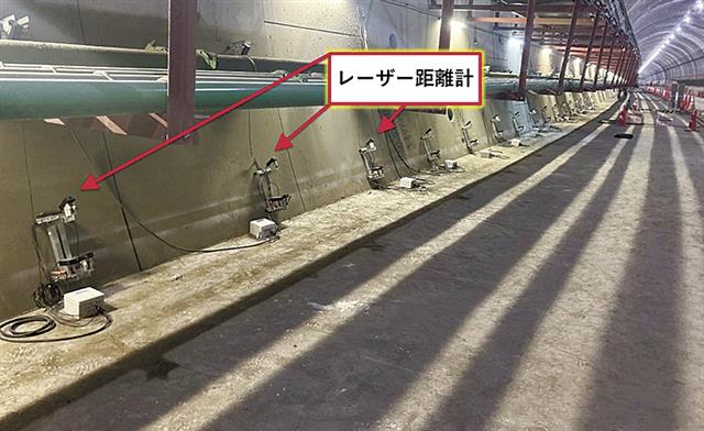 大成建設は、マック(千葉県市川市、宮原宏史社長)と共同で、トンネルの内空変位計測を高精度・省力的に行う自動計測システム「T-レーザートンネルウォッチ」を開発した。多数のレーザー距離計を無線で制御し、変位を連続的に長期間自動計測できる。従来、トータルステーションによる計測では機器の設置だけで約30分を要していたが、新システムは壁面に固定用ボルトを1点留めするだけで設置が完了し、計測作業の大幅な効率化を実現した。 併設トンネル工事では従来、新設トンネル工事の進捗(しんちょく)に合わせてトータルステーションを使って既設トンネルを人力で測量していた。しかし、トンネルのカーブ区間や支障物、車両の往来などにより計測範囲が制限されるほか、計測作業や計測機器の盛り替えに人手が必要であり、さらに計測データのリアルタイムでの入手や経時変化の把握が困難だった。