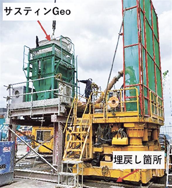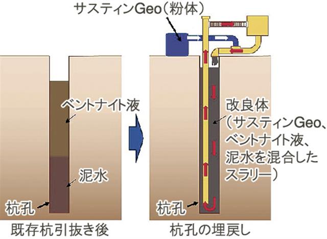 今回、フライヤーNALT工法(杭孔の埋め戻し時に孔内で泥水、ベントナイト液と固化材を循環・攪拌する工法)による既存杭撤去後の杭孔の埋め戻しの固化材としてサスティンGeoを使用。直径約1.8m、深度約15mの杭孔9カ所の埋め戻しを行った。