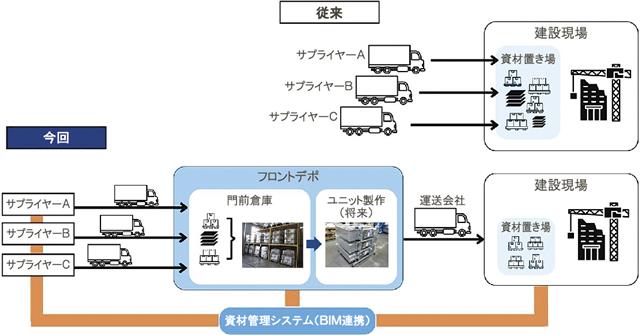 今後は、資材検収や出来高管理、工程管理システムとの連携を進める。さらに、「フロントデポ」として門前倉庫を運用し、ユニット製作できる体制を構築するとともに、生産・保管・輸送を一元化する拠点にすることを目指す。