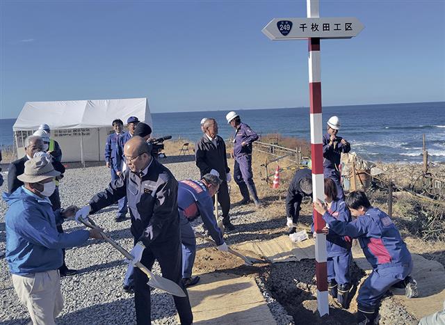 同日には、名舟海岸近くの同市白米町で中心杭の設置作業を行い、坂口茂市長や地元住民のほか、県職員らも参加した=写真。