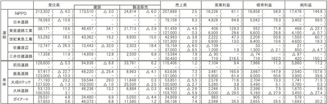*上場は東亜道路工業、世紀東急工業、佐藤渡辺、三井住建道路、非上場はNIPPO、日本道路、前田道路、鹿島道路、大成ロテック、大林道路、ガイアート。掲載順序は売上高順