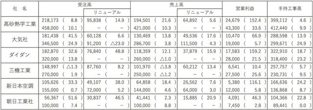 *単位100万円、カッコ内は前期比、△は損失または減少。上段は2026年3月期第2四半期業績、下段は26年3月期通期予想 *高砂熱学工業のリニューアルは単体(連結非公表)、新日本空調のリニューアルは単体(原子力関係除く、連結非公表)、掲載順序は売上高順 空調衛生設備工事を主力とする上場大手6社の2026年3月期第2四半期決算(連結)が、14日に出そろ…