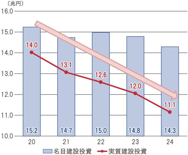 物価高で地域の建設業者の実態が見えにくくなっているが、物価高などの影響を含めた名目の政府公共投資額は21年度から24年度まで14兆円台で推移している一方、実質の政府公共投資額は21年度の13兆1000億円から24年度は11兆1000億円にまで減った。国土交通省関係の公共事業関係費も、ここ数年、当初が5兆3000億円程度、補正予算を合わせて年間7兆円前後とほぼ横ばいが続いている。25年度も当初の国交省関係公共事業予算は横ばいだったため、補正予算で2兆円が計上されても、額面は「横ばい」で、実質の投資額は減少する。