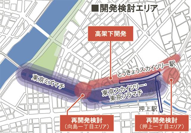 同社は再開発のほか、とうきょうスカイツリー駅付近の高架化に伴う高架下スペースの有効活用や、東京ソラマチの増床を検討している。高架下の開発は、高架工事が完了した28年度以降から、段階的に整備する。