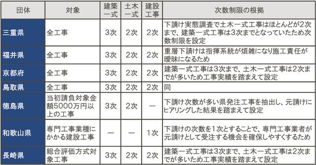 徳島県は7月から下請け次数制限の試行を始めた。当初請負対象金額5000万円以上の土木一式工事と建築一式工事を対象とし、次数を超える場合は施工体制台帳と施工体系図の写し、理由書の提出を求める。