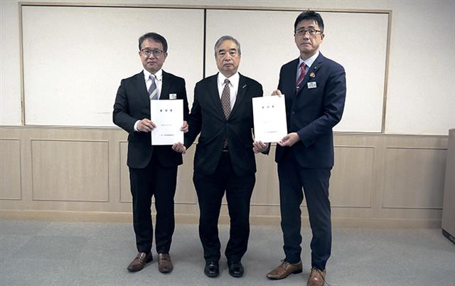 (左から)要望書を交わす松浦部長、三木会長、宇野部長