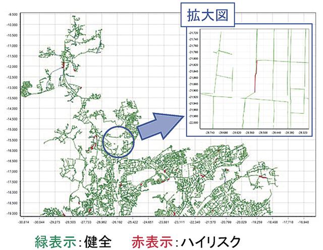 導入した「硫化水素劣化予測診断技術」は微生物による管路の劣化予測を適切に評価することで、硫化水素の生成から劣化までをシミュレーションで診断できる。管路・人孔の設置年度や材質、管径、深度といった基本情報、定期点検による劣化の進行状況、汚水・汚泥のサンプリング分析(微生物の地域性)により、従来の簡易評価式では難しかった硫化水素の生成、硫化水素の硫酸化、管内温度依存を考慮した詳細な管路劣化予測が可能。リスク度合いを反映した管路の最適な更新・更生計画の策定に役立てられる。