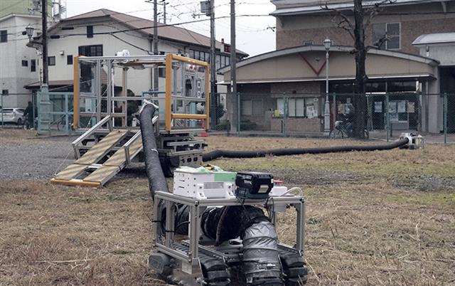 使用した機材は、排水用のホースを設置する「i-centiPot-Ammonite(アイセンチポットアンモナイト)」やクローラーロボット「d-Frex-Crow(ディーフレックスクロー)」、ロボットを格納して搬送する汎用(はんよう)搬送コンテナ「BRAIS(ブレインズ)」など4種類。現地までヘリコプターで運搬し、いずれも遠隔操作で作動する。