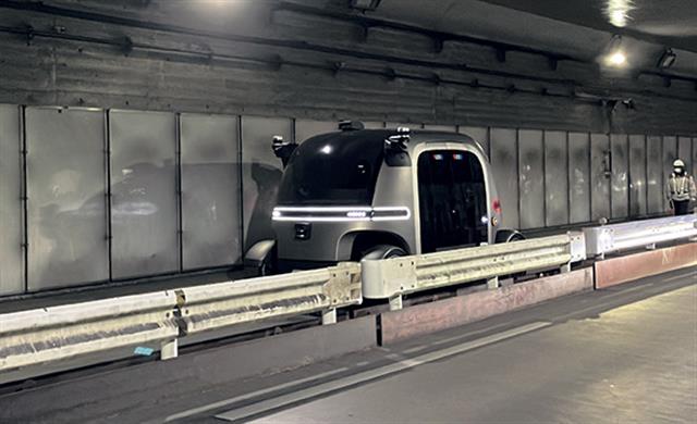 12月15日は、大成建設と大成ロテック、ティアフォーが開発している技術の自動走行実験を実施した。自動走行車両が自己位置を把握するためのLiDAR(レーザー式測距装置)は、トンネル内で位置情報にズレが生じがちなため、トンネル壁面などに等間隔で反射材を設置することで、安定走行を実現する技術となる。実験時は、隣の車線を一般車両が走行するトンネル内を自動運転車両が安定的に走行した。