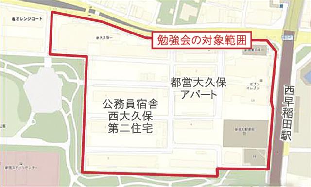 同検討協議会の前身となる再開発勉強会は、大久保3-11~14の地権者を対象に、23年9月に設立。再開発事業の仕組みや単独建て替えと共同建て替えの比較など一般的な再開発事業の仕組みや事例などを勉強していた。