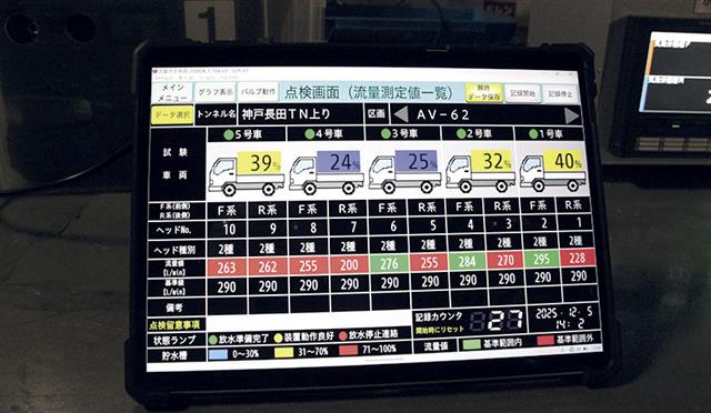 点検は、50mを1区画とし、1区画内に10カ所の水噴霧設備のヘッドがある。測定装置はトラック1台当たり2ヘッド分を点検できる。新長田トンネルでは、長さ1㎞、18区画が対象となる。各ヘッドから貯水槽へ放水する際に放水量を計測しながら、貯水槽の水を排水する。1区画の放水は40秒で完了する。