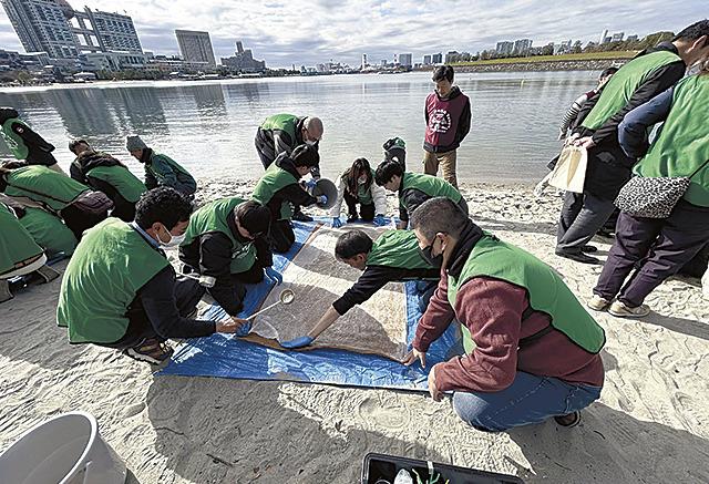 東洋建設は、東京都がお台場海浜公園で開いたアマモ種まき会に協力した=写真。都が2024年12月に策…