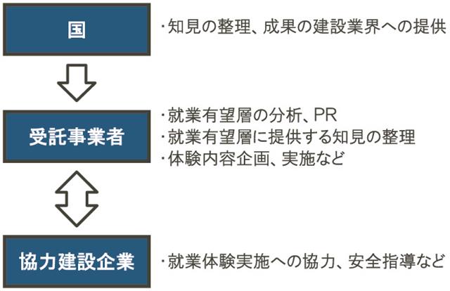 具体的には事業の受託者が就業有望層の分析やPR手法の検討を進め、建設会社の協力を得ながら就業体験を実施したり、関心を持った有望層に対する就労支援制度の情報提供を行ったりする。