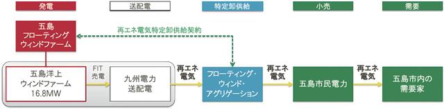戸田建設が出資するフローティング・ウィンド・アグリゲーション(FWA、長崎県五島市)は5日、地域の企業や施設に向けた電力卸供給を始めた。同日に運転を開始した浮体式洋上風力発電所「五島洋上ウィンドファーム」の電力を活用する。国の特定卸供給制度とFIT(固定価格買取制度)を組み合わせ、大規模洋上風力発電による電力を地域内に循環させる地産地消モデルの実践に乗り出す。 導入したスキームは、発電事業者のFWFから、地域アグリゲーターを担うFWAが特定卸供給で電力を調達する。これを地域の小売電気事業者「五島市民電力」を通じて、市内の公共施設や民間の需要家に供給する。