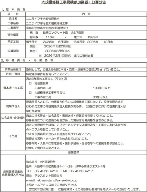 ユニライフ宇治II管理組合は、同住宅大規模修繕工事の見積もり参加希望者を募集する。=右欄に公告