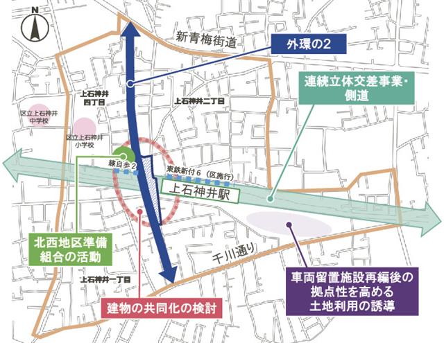 東京都練馬区の西武新宿線上石神井駅周辺では、連続立体交差事業や外環の2などの整備に伴うまちづくりが検討されている。北西地区には、日鉄興和不動産が事務局を務める市街地再開発事業準備組合が設立され、再開発に向け検討を進めている。また、交通広場の整備や、同駅南東側で連続立体交差事業に伴う車両留置施設再編後に、拠点性を高める土地利用の誘導なども計画されている。 区が、2015年12月に改定した都市計画マスタープランでは、同駅周辺を地域拠点に位置付け、土地の高度利用や適切な土地利用を進めるとした。21年6月に改定した「上石神井駅周辺まちづくり構想」や、24年3月に策定した「上石神井駅周辺地区地区計画」では、市街地再開発事業などによる土地の有効かつ高度利用を促進し、にぎわいのある駅前空間を創出する地区に位置付けている。