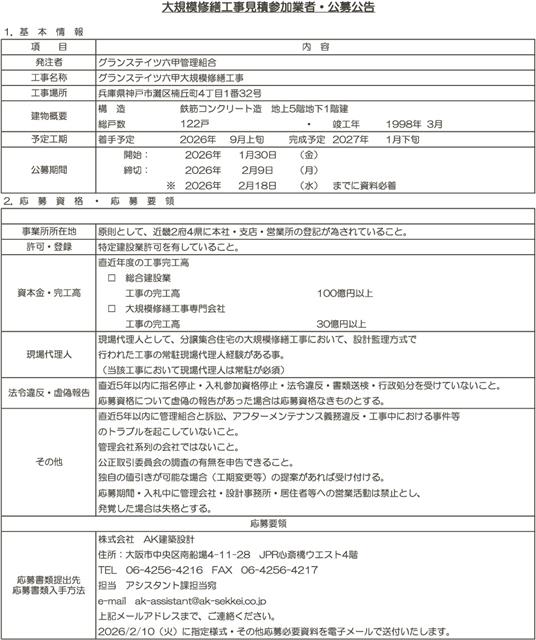 グランステイツ六甲管理組合は、同住宅大規模修繕工事の見積もり参加希望者を募集する。=右欄に公告