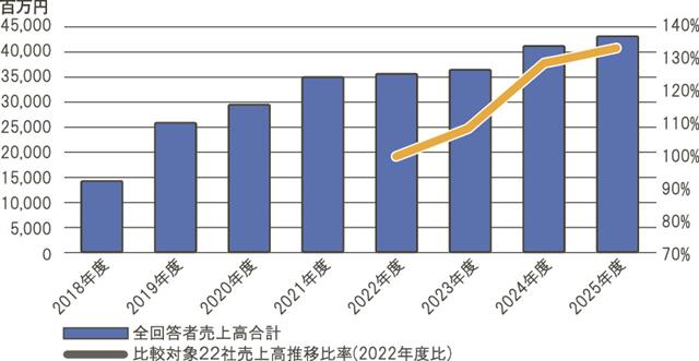 「比較対象22社」は、22-25年度全てに回答した会社の集計。22年度売上高を100%とした比率