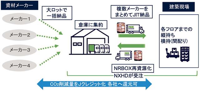 工程に合わせて必要な資材を複数メーカー分まとめてジャストインタイムで共同配送するほか、現場到着後は、日本通運がエレベーター運用会社と連携し、エレベーターの積み込み、各フロアでの横持ち(間配り)までを一貫して実施する。さらに、復路は往路で使用したロールボックスを端材回収容器「NRBOX」として活用。広域認定制度により端材の水平リサイクル(再資源化)を行うなど、一貫したサービスを提供する。