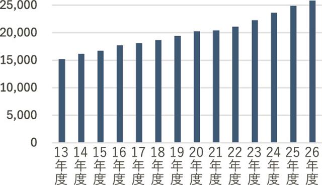 伸び率は、5%を上回った23-25年度と比べるとやや低くなった。調査で把握した最新の労働市場の実勢価格を踏まえて設定するため、直近3年と比べ技能者の賃金の伸びが弱くなったとみられる。