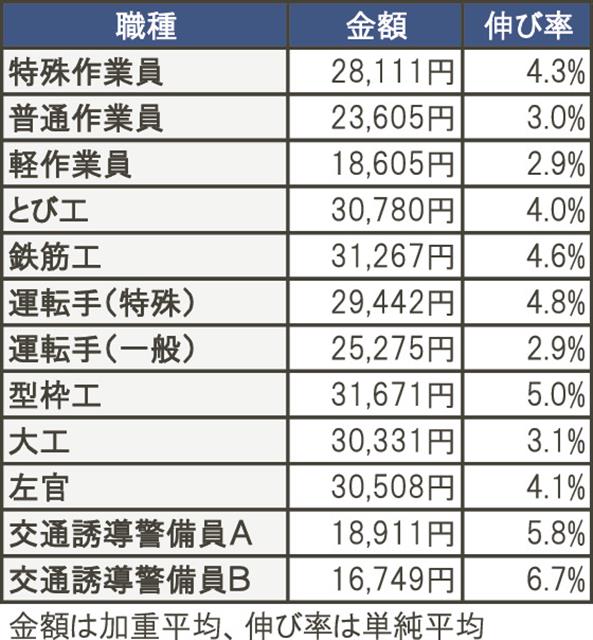 公共工事の現場労働者の8割以上を占める主要12職種(特殊作業員、普通作業員、軽作業員、とび工、鉄筋工、運転手〈特殊〉、同〈一般〉、型枠工、大工、左官、交通誘導警備員A、同B)の全国単純平均の伸び率は4.2%、加重平均の金額は2万4095円となった。