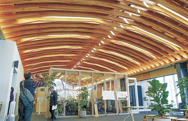 清水建設は、東京都江東区の東京木工場を全面建て替えた。既存施設群計11棟を順次解体・機能移転しながら「来客棟」「工場棟」を新築し、機能を2棟に集約した。建て替えに当たっては、新たに開発した屋根架構などの技術を数多く投入し、木質建築の新たな可能性を具現化した。 =1面参照