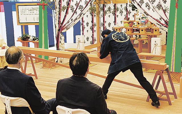 19日の竣工式では、約50人の役職員が働く工場の新たな門出を祝うとともに永続的な発展を祈念して「検尺の儀」を行った。木の伝統技術を連綿と継承していくとともに、新工場を宮大工を祖業とする同社のブランディングにも活用する。