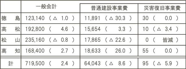 四国の県庁所在地4市の2026年度予算案が25日に出そろった。一般会計の総額は前年度比2.4%増の7195億円となった。一方、普通建設事業費は8.6%減の640億4300万円となり、700億円を割り込んだ。徳島市が3割、松山市が2割落ち込んだことが影響している。各市とも、持続可能なまちづくりや安全・安心につながる施策に重点配分した。