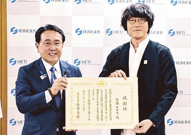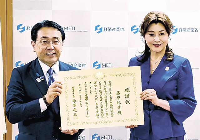 赤澤亮正経済産業相は25日、昨年10月に閉幕した2025大阪・関西万博に経済産業省として出展した「日本政府館(日本館)」の功労者に感謝状を授与した。受賞者は日本館総合プロデューサーでデザイナー・建築家の佐藤オオキ氏、日本館名誉館長で俳優の藤原紀香さんの両名。