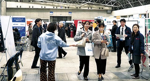 開始時刻の正午を回り、通路を歩き始めたリクルートスーツ姿の学生。途端にあちらこちらから“呼び込み”の声が会場に響く。他社に負けじとブースから身を乗り出し、猛烈なアピール合戦が始まった。大きな身ぶり手ぶりで「話を聞いて」と呼び掛ける。足が止まれば、即座に資料で図説。隣のブースに声をかき消されまいと、声を張り上げて自社の強みをPRする。