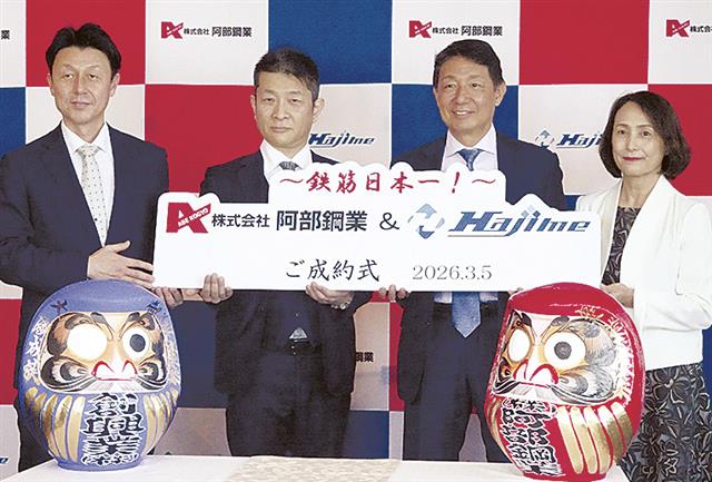 これまで地域内同士の経営譲渡が主流だった鉄筋工事業で、広域再編によってこれまで専門工事業が直面する課題解決を目指す動きが出始めた。阿部鋼業(横浜市、阿部政彦会長)と、創興業(香川県坂出市、前田武士代表取締役)は5日、仲介した日本M&Aセンターでホールディングスを頂点にした阿部鋼業グループ4社の全株式を創興業に譲渡する契約締結式を開いた。