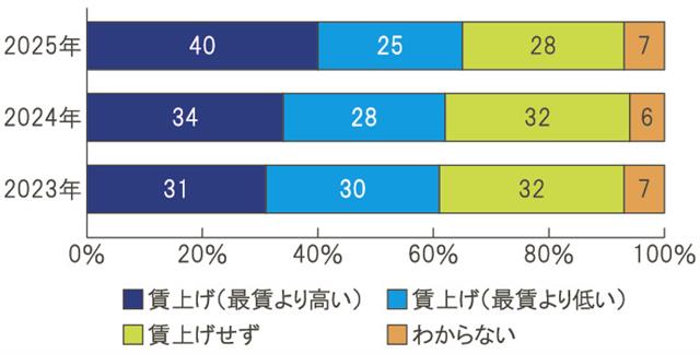 今回の2025年調査によると、賃上げした企業は65%で、前年より3ポイント増加している。現在の賃金が最低賃金に比べて高いにもかかわらず、賃上げしている企業も増加傾向にある。23年は31%だったが、24年に34%、25年は40%となっている。賃上げしていない企業の割合は減少している。