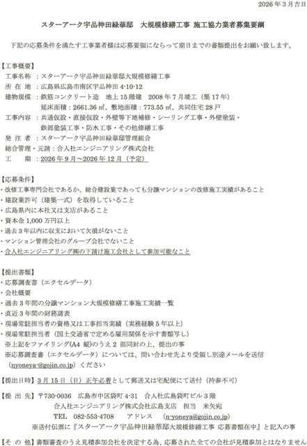 スターアーク宇品神田緑華邸管理組合は、大規模修繕工事の施工協力業者を募集する。 =右欄に公告