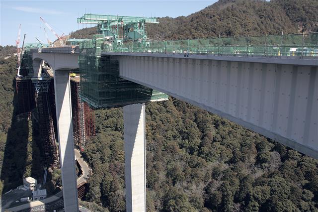 区間内は山間部を抜けるため、技術的難易度の高い工事も多い。信楽川橋(仮称)の現場では、自然環境にも配慮しながら工事を実施している。同橋は、信楽川と国道422号を横過する橋梁だ。長さは上り線が608m、下り線が664m、橋脚の高さは最大97m。最大支間長は国内最大規模の180mとなる。