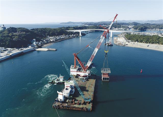 【高知港海岸湾口地区津波防波堤築造工事(その2)/若築建設・りんかい日産建設JV/ARでケーソン誘導…