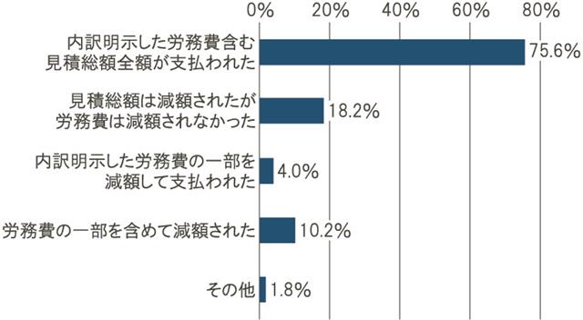 労務費を内訳明示した見積書を交付した際の元請けの対応を下請けに聞くと、労務費を含む見積額全額が支払われる契約となったのが75.6%に上った。見積額は減額されたが労務費は減額されない契約の下請けも18.2%いた。