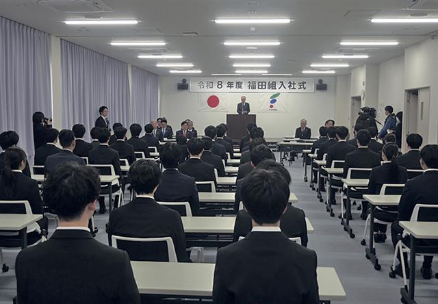 福田組は1日、新潟市の同社牡丹山研修センターで入社式を開いた=写真。 荒明正紀社長は、「当社は社是…