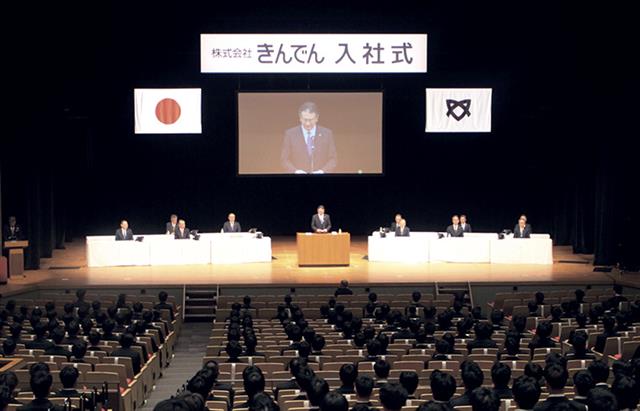 きんでんは1日、大阪府吹田市の同市文化会館で2026年度入社式を開いた=写真。474人の新入社員を…