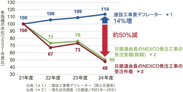 また、NEXCO3社の工事では、財源不足を理由とする数量減や打ち切りも2-4割程度で発生しており、安定的な事業推進に必要な財源拡大や契約変更に必要な財源確保などを呼び掛けた。