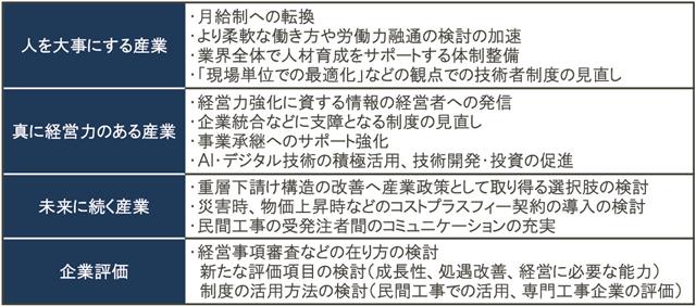 取りまとめをベースとした政策立案に当たっては、土木と建築、都市と地方、業種や職種、技術者と技能者の違いを念頭に、きめ細かく実態を把握・分析することを要請した。