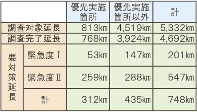 応急措置を実施した上で5年以内の対策が見込まれる緊急度IIの延長は547㎞。優先実施箇所が259㎞、それ以外の箇所が288㎞だった。