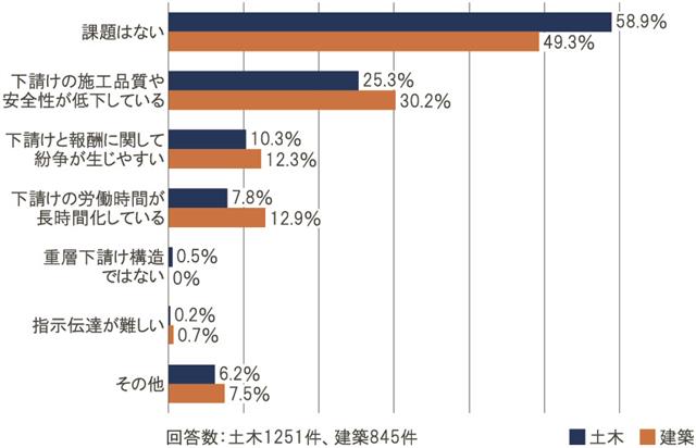 一方で注文者目線の回答では「下請けの施工品質や安全性が低下している」が多く、土木、建築とも約3割に達した。そのほか、「下請けと報酬に関して紛争が生じやすい」「下請けの労働時間が長時間化している」が1割程度に上った。