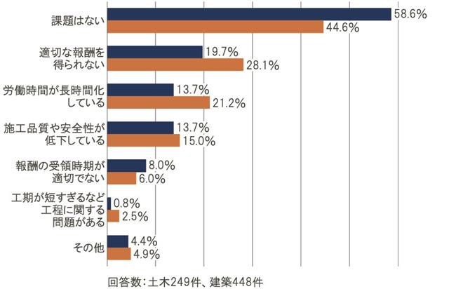 重層下請け構造に起因する課題について、請負人目線では「適切な報酬を得られない」との回答が多く、土木で約2割、建築で3割近くに上った。「報酬の受領時期が適切でない」も1割弱を占めた。