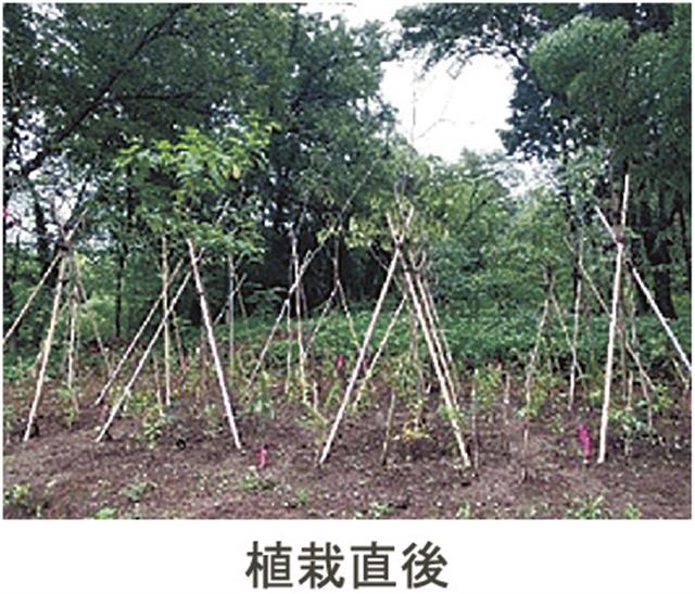 0.6mの苗木から4mに到達するまでの期間は、従来技術で平均5年3カ月だったが、同手法を活用すると平均3年4カ月になる。4年間で4mまで育てるのに必要な初期樹高は、従来の1.2mに対して0.6mであり、施工価格が約40%削減できる。